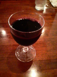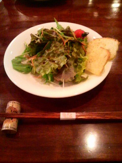 もっちもちのお茶入りニョッキ、ガーリックラスクつきのサラダ、100%赤ブドウジュース