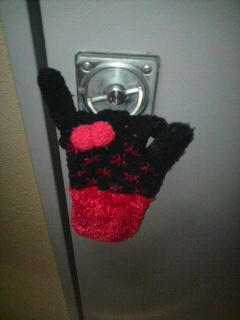 写真はマンションの階段の非常扉に引っかけられてた…なんだこれ、手袋?